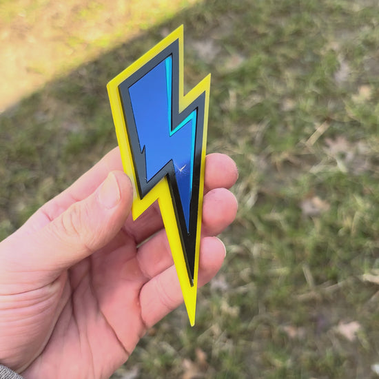 Introducing the Lightning Bolt Car Badge. This striking badge features a bold lightning bolt design and installs in seconds using included VHB automotive tape—no tools or drilling required. Sticks to any flat surface: car fenders, trunks, interior panels, toolboxes, fridges, and more. Built tough with industrial-strength adhesive tested through Alaskan winters and Texas summers. Fully UV, salt, and all-weather resistant for lasting durability. Five inches tall. Perfect for those who want to showcase their bold style and electric energy wherever they go.