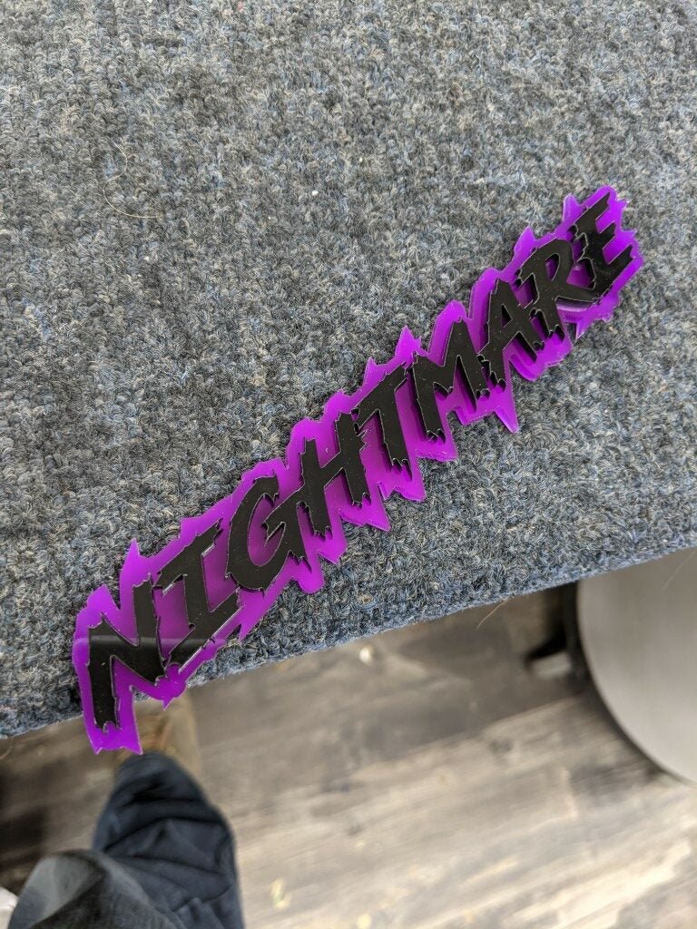 Nightmare Car Badge - Gloss Black On Purple - Lightning Font