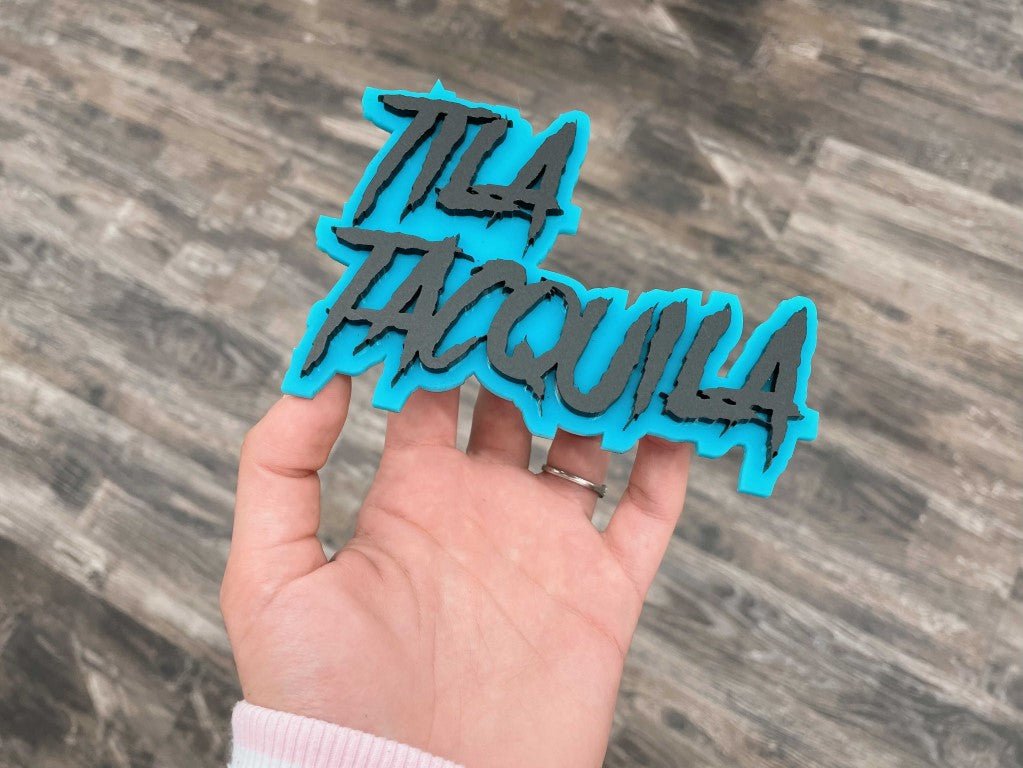 Tila Tacquila Lightning Car Badge - Matte Black On Teal - Aggressive Font